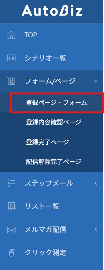 トップの「登録ページ・フォーム」をクリック。
