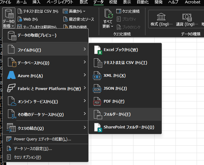 「データ」→「データの取得」→「ファイルから」→「フォルダから」を選択。