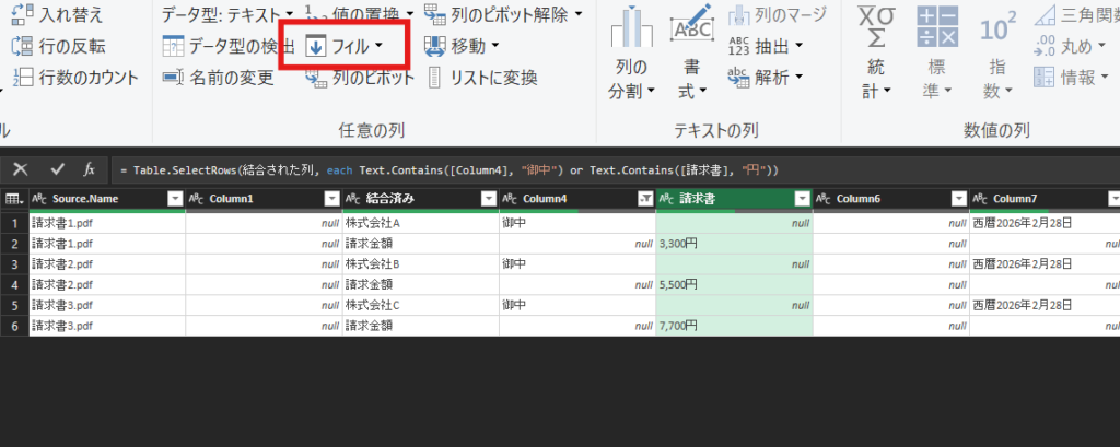 「請求書」の列を選択して、「フィル」→「上へ」。