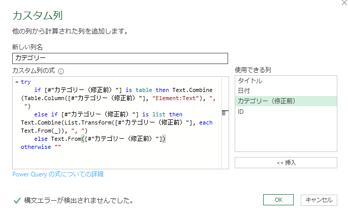 else if [#"カテゴリー(修正前)"] is list then Text.Combine(List.Transform([#"カテゴリー(修正前)"], each Text.From(_)), ", ")