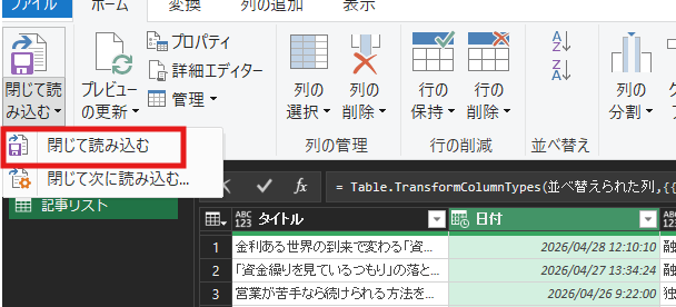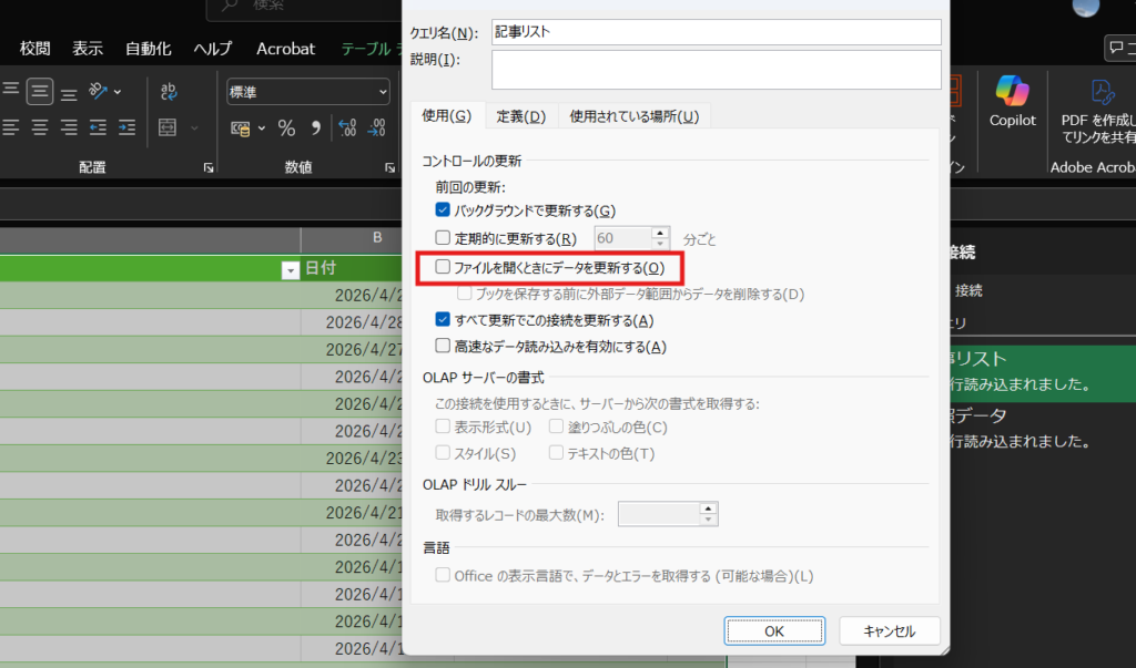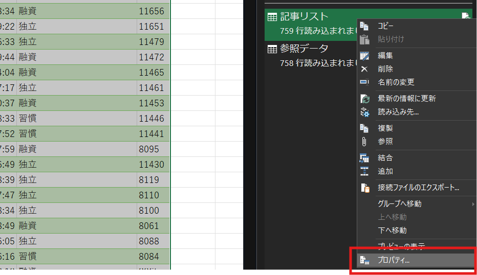 また、右側のクエリ一覧→記事リストの上で右クリック→「プロパティ」→「ファイルを開くときにデータを更新する」にチェックを入れておけば、ファイルを開くたびに自動で更新されます。