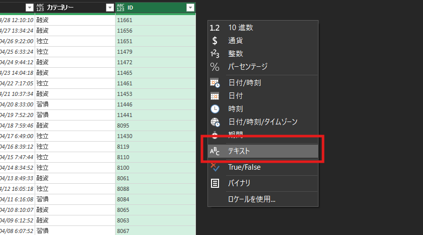 「日付」の左横のABC123をクリック→「日付/時刻」を選択します。