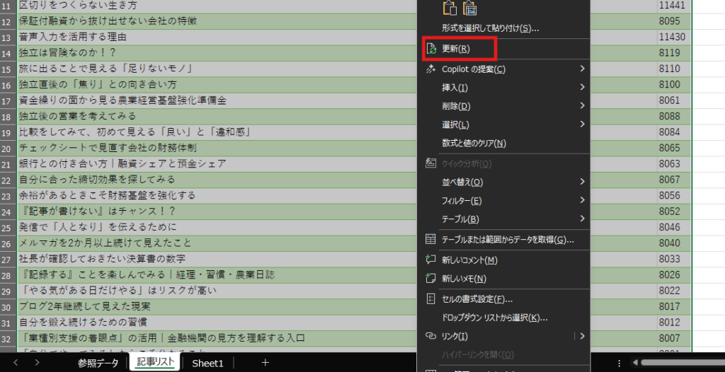 更新は「記事リスト」のシートを選択→テーブルを選択→右クリック→「更新」でOKです。