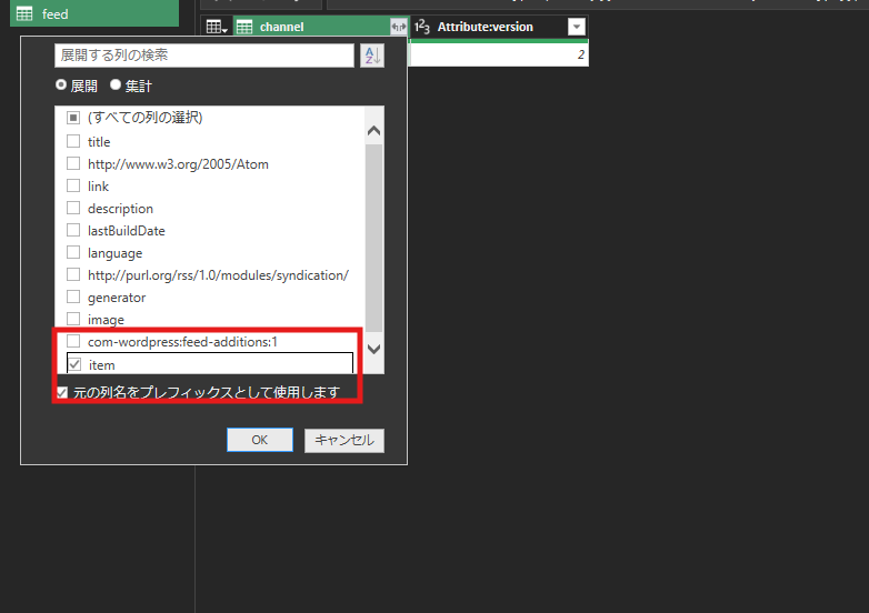 「channel」横の←→ボタンをクリック→「item」だけにチェックを入れて「OK」をします。