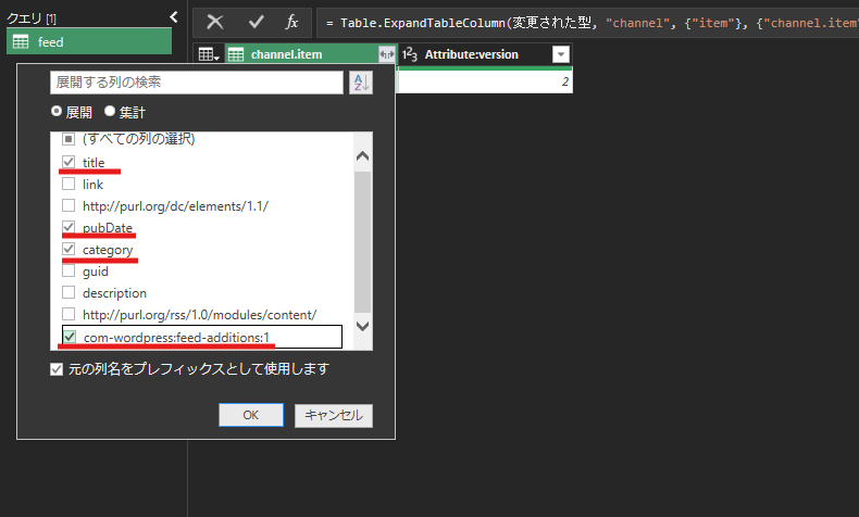 今度は「channel.item」の←→ボタンをクリック→「title」「pubDate」「category」「com-wordpress:field-additions:1」にチェックを入れて、「OK」。