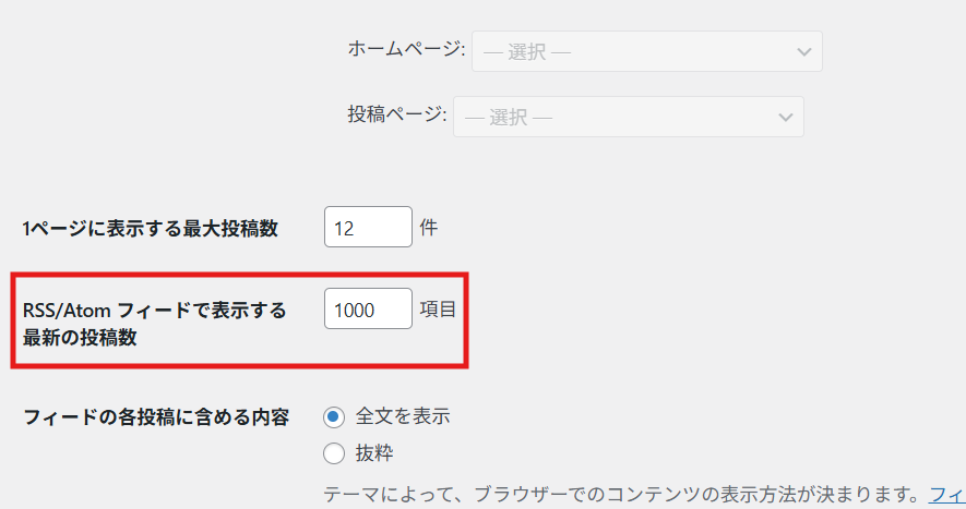 その後、Wordpressの「設定」→「表示設定」→「RSS/Atomフィードで表示する最新の投稿数」で、1000に設定した箇所を10に戻します。