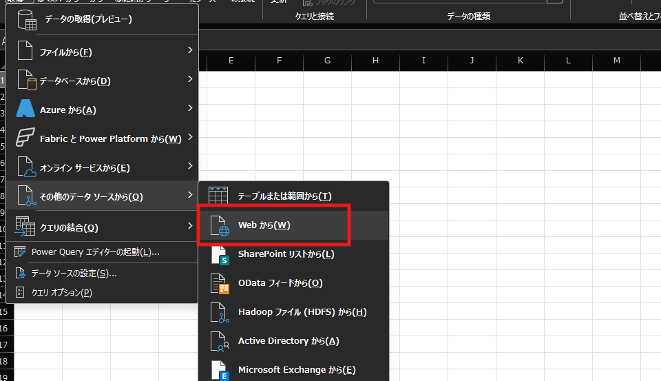 次に、Excelを開き、「データ」→「データの取得」→「その他のデータソースから」→「Webから」を選択。