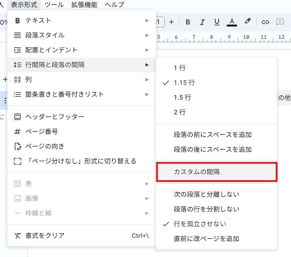 「表示形式」→「行間隔と段落の間隔」→「カスタムの間隔」を開きます。