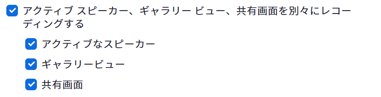 Zoom.usに行き→「設定」→「レコーディング」→「アクティブスピーカー、ギャラリービュー、共有画面を別々にレコーディングする」にチェックをいれておきましょう。